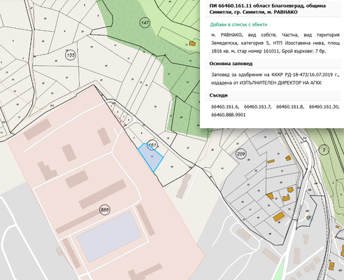 Поземлен имот с идентификатор 66460.161.11 по кадастралната карта и кадастралните регистри на гр. Симитли, общ. Симитли, обл. Благоевград, одобрени със Заповед №РД-18-472/16.07.2019 г. на Изпълнителен директор на АГКК. Последно изменение на кадастралната карта и кадастралните регистри, засягащо поземления имот: няма извършено изменение на КККР със заповед. Адрес на поземления имот: гр. Симитли, местност: Равнако, Площ: 1816 кв.м. Трайно предназначение на територията: Земеделска. Начин на трайно ползване: Изоставена нива. Категория на земята при неполични условия: 5. Предишен идентификатор: няма. Номер по предходен план: 161011. Съседи: 66460.888.9901, 66460.161.8, 66460.161.7, 66460.161.30, 66460.161.6