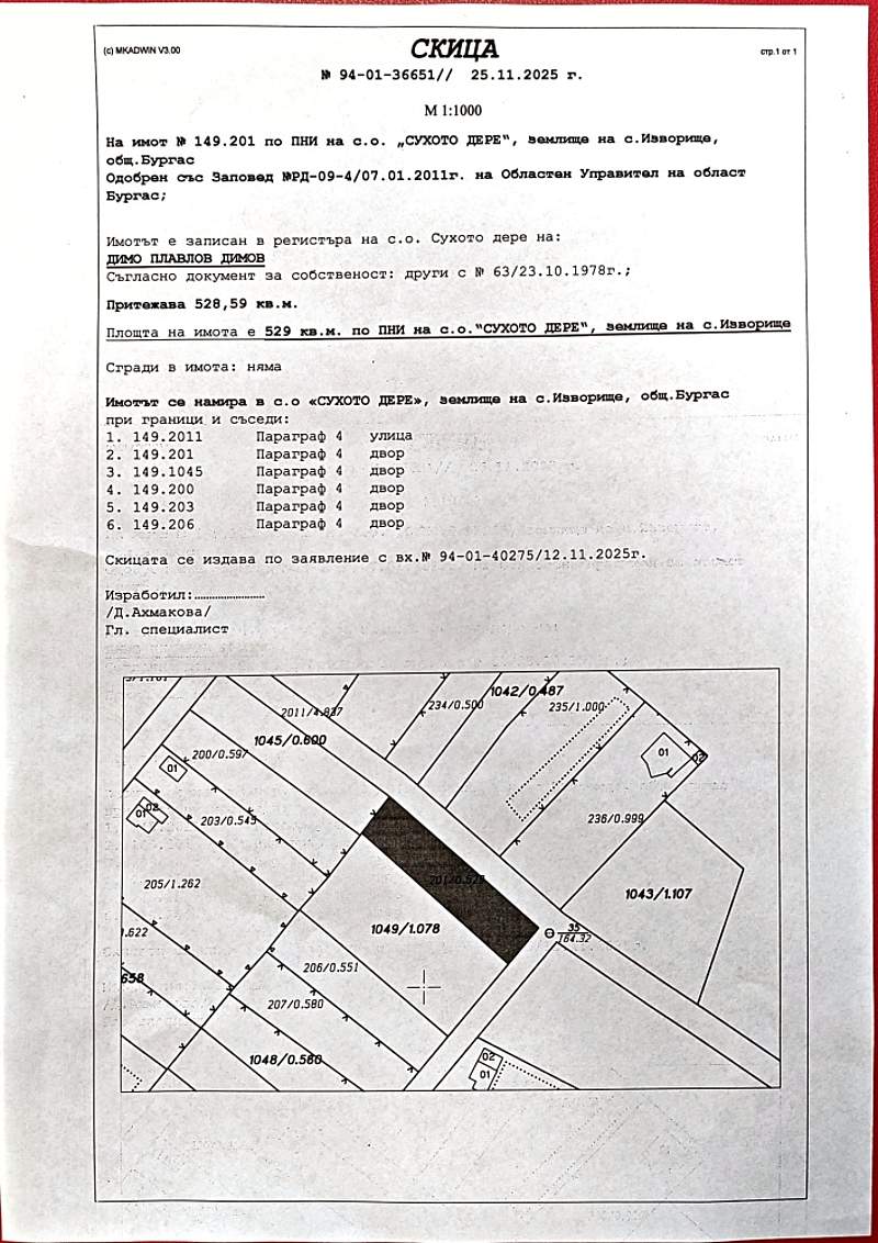 ПОЗЕМЛЕНИМОТ№ 149.201по ПНИ на с.о."Сухото дере", землището на с.Изворище, общ.Бургас, одобрен със Заповед №РД-09-4/07.01.2011г. на Областен Управител на обл.Бургас, с площ от 529кв.м. по скица от 19.11.2025г., при граници и съседи: имот № 149.2011 – улица, имот №149.1045 – двор, имот № 149.1049 – улица; който недвижим имот съгласно документ за собственост от 18.05.2011г. представлява ПОЗЕМЛЕН ИМОТ 149.201 в землището на с.о."Сухото дере", с.Изворище, общ.Бургас, с площ по скица от 2011г. издадена от Община Бургас в размер на 528,29кв.м., а съгласно предходен документ за собственост от 1995г. е с площ от 600кв.м., съставляващ бивш имот 201 в кв.22 по плана на м."Сухото дере", с.Изворище, при граници: североизток – улица, северозапад – имот 149.1045, югозапад – имот 149.1049, югоизток – улица;С НАЧАЛНА ТРЪЖНА ЦЕНА В РАЗМЕР НА 6 699.97евро (шест хиляди шестотин деветдесет и девет евро и деветдесет и седем евроцента)