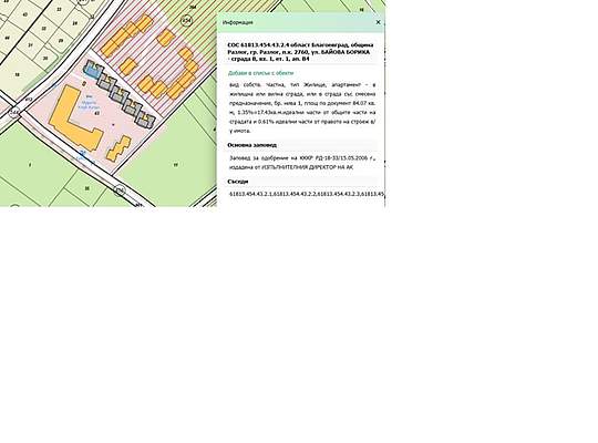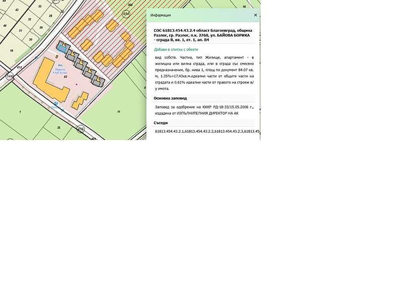 Предмет на публичната продан е самостоятелен обект в сграда с идентификатор 61813.454.43.2.4 по кадастралната карта и кадастралните регистри, одобрени със Заповед РД-18-33/15.05.2006г./ 15.05.2006г. на Изпълнителен директор на АК, последно изменение на кадастралната карта и кадастралните регистри, засягащо самостоятелния обект е от 16.01.2020г., адрес на имота: гр. Разлог, п.к. 2760, ул. БАЙОВА БОРИКА – сграда В, вх. 1, ет. 1, ап.В4. Самостоятелният обект се намира на етаж 1 в сграда с идентификатор61813.454.43.2, предназначение: Апартаментен Хотел, разположена в поземлен имот с идентификатор 61813.454.43 по кадастралната карта и кадастралните регистри, одобрени със Заповед РД-18-33/15.05.2006г./15.05.2006г. на Изпълнителен директор на АК, последно изменение със заповед: КД-14-01-315/16.03.2007 г./16.03.2007г. на началника на СК-БЛАГОЕВГРАД, адрес на поземления имот: гр. Разлог, п.к. 2760, местност БАЙОВА БОРИКА /пром. предназначение с реш. №ОД-11/26.09.2006г./, площ: 10974 кв.м., трайно предназначение на територията: Урбанизирана, начин на трайно ползване: Комплексно застрояване, съседи: 61813.456.137, 61813.454.358, 61813.454.364, 61813.454.360, предназначение на самостоятелния обект: жилище, апартамент- в жилищна или вилна сграда, или в сграда със смесено предназначение, брой нива на обекта: 1, посочена в документа площ: 84.07 кв. м. и прилежащи части: 1.35 %= 17.43 кв. м. идеални части от общите части на сградата и 0.61 % идеални части от правото на строеж в/у имота. Ниво: 1, съседни самостоятелни обекти в сградата: на същия етаж: 61813.454.43.2.3, 61813.454.43.2.5, под обекта: 61813.454.43.2.2, над обекта: 61813.454.43.2.7. Мурите Клуб Хотел е разположен в полите на Пирин непосредствено до Пирин Голф, в Разложката котловина, едно от най-живописните кътчета в България, приютило редица исторически, културни и природни забележителности,на 10 минути път от Банско, Клуб Хотел Мурите предлага безброй възможности за приятна семейна почивка, спортна ваканция или забавен уикенд с приятели през всички сезони. Координати: 41°51'39.9"N 23°24'56.1"E; 41.861085, 23.415572 Развитие на района: добре развит.Транспортна достъпност: много добраПоддържане: добро.Привлекателност: добра. Инженерната инфраструктура на района:Водопровод и канализация ■ ДаЕлектрификация ■ ДаУлична мрежа с трайни пътни настилки ■ Да МУРИТЕ Клуб Хотел се състои от 4 тематични сгради, носещи красиви имена на екзотични цветя – АЗАЛИЯ, ОРХИДЕЯ, КАМЕЛИЯ и ЖАСМИН. Апартхотелът се отличава със забележителна архитектура и възхитителен интериор. В основната сграда АЗАЛИЯ са разположени: рецепция, лоби бар с камина, детски кът, спа център с басейн, магазин, ресторант, нощен бар, зала за игри, конферентна зала. В сградите са разположени 130 стаи и апартаменти, всеки от тях модерно обзаведен. Клуб Хотел МУРИТЕ разполага с 3 басейна – вътрешен, външен и външен детски. За почитателите на спортните занимания, има фитнес, както и 2 игрища, съответно с размер 22/44м и мини игрище. Предназначение и етажностМУРИТЕ Клуб Хотел се състои от 4 тематични сгради, носещи красиви имена на екзотични цветя – АЗАЛИЯ, ОРХИДЕЯ, КАМЕЛИЯ и ЖАСМИН. Апартхотелът се отличава със забележителна архитектура и възхитителен интериор.Година на построяване2009 г.Конструкция Сградите са изградени по традиционния монолитен способ с носещи стоманобетонна конструкция и ограждащи и преградни тухлени стени.Покривът на сградите е стоманобетонов с топло и хидроизолация, покрити с керемиди.Фасади – Фасади
