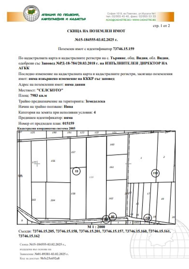½ ид.ч.отПоземлен имот с идентификатор 73746.15.159 област Видин, община Видин, с.Търняне, м. СЕЛСКОТО, вид собств. Частна, вид територия Земеделска, категория 4, НТП Нива, площ 7983 кв. м, стар номер 015159, Брой върхове: 7 бр., при съседи на имота по скица: 73746.15.157, 73746.15.158, 73746.15.160, 73746.15.161, 73746.15.162, 73746.15.201, 73746.15.205.