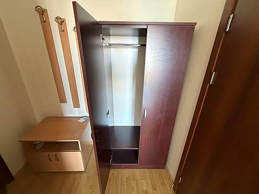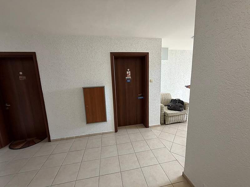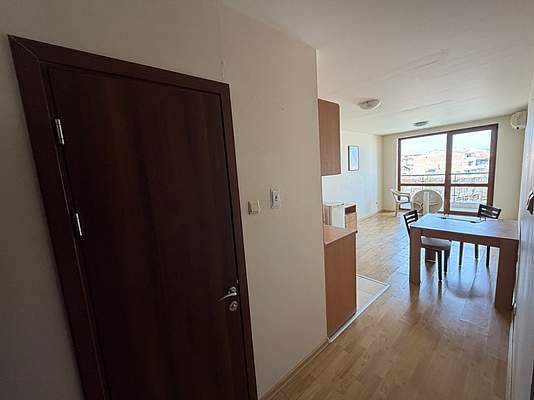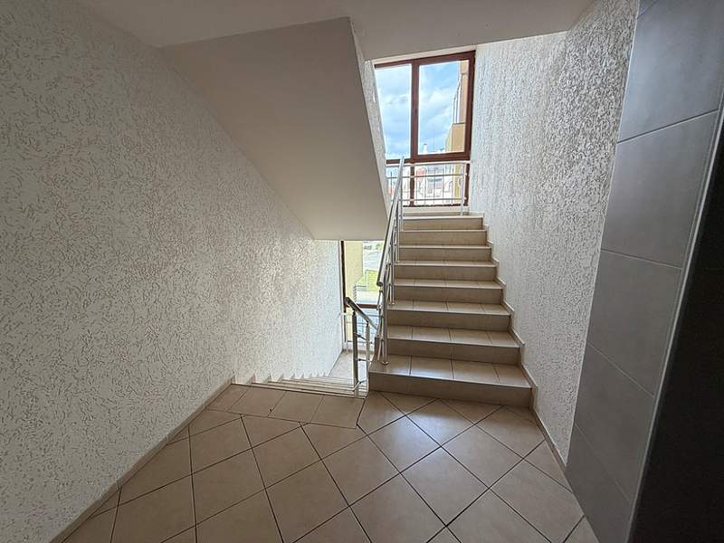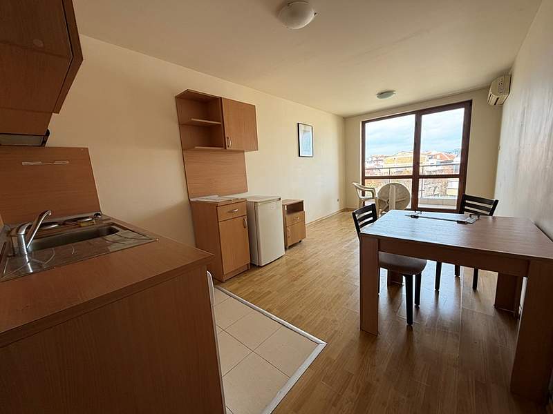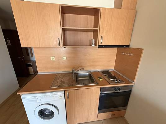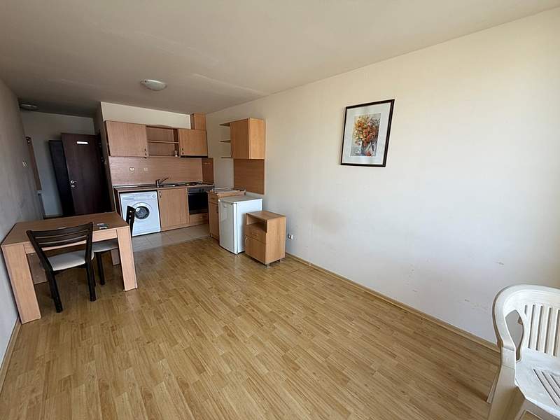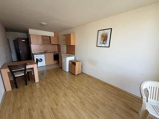 НЕДВИЖИМ ИМОТ, а именно: СТУДИО № 34 А/тридесет и четири буква "А"/изписва се на латиница 34 А/, представляващ САМОСТОЯТЕЛЕН ОБЕКТ В СГРАДА с идентификатор 51500.502.447.4.134/петдесет и една хиляди и петстотин,,точка,петстотин и две, точка, четиристотин четиридесет и седем, точка, четири, точка, сто тридесет и четири/ по кадастралната карта на гр. Несебър, област Бургас, с адрес на гр. Несебър, ул."Иван Вазов" № 9/девет/ на пети етаж, на кота +12,00/плюс дванадесет цяло/м. от сграда, бл.4 /четири/, секция А, а по архитектурен проект секция 1 /първа/, вход А,ап.134/ сто тридесет и четири/, с предназначение-жилище, апартамент, състоящ се от антре, стая-спалня с кухненски бокс, баня с тоалетна и тераса, със застроена площ от 35,56 /тридесет и пет цяло цяло и петдесет и шест/ кв.м., ведно с 8,43/осем цяло и четиридесет и три/ кв.м.,представляващи 0,290 % /нула цяло двеста и деветдесет хилядни процента/ ид.части от общите части на сградата или с обща площ от 43,99 кв.м./четиридесет и три цяло и деветдесети девет стотни кв.м./,при граници на самостоятелния обект: студио № 33 А /изписвано на латиница като № 33 А /, студио № 22 Б /изписва се на латиница като 22 В / от секция 2, вътрешен коридор и стълбище, външен зид, а по кадастралната карта при съседи на същия етаж-самостоятелен обект с идентификатор № 51500.502.447.1.133, №51500.502.447.4.222, № 51500.502.447.4.223, под обекта-самостоятелен обект с идентификатор 51500.502.447.4.127,както и ведно със съответните припадащи се на студиото идеални части от правото на строеж върху прилежащия на сградата терен. Продаваният самостоятелен обект попада в сграда с идентификатор 51500.502.447.4 /петдесет и една хиляди и петстотин,,точка,петстотин и две,точка,четиристотин четиридесет и седем,точка,четири/, която сграда е построена в поземлен имот с идентификатор 51500.502.447 /петдесет и една хиляди и петстотин,,точка,петстотин и две,точка,четиристотин четиридесет и седем/ по кадастралната карта на гр.Несебър, Област Бургас- целият имот с площ от 12 176.88 кв.м., при съседи на същия: поземлени имоти 51500.502.452, 51500.502.450, 51500.502.451, 51500.502.432 и 51500.502.448, ведно с находящите се в имота движими вещи: Имота се намира в жилищна, монолитна сграда, в район с изгредан инженера инфраструктура, входът разполага с работещ асансьор. Състои се от стая с предверие, бана-тоалетна и тераса. Вх. Врата - ламиниран МДФ, под ламинат, /около 3 кв.м. теракот/, стен и итаван – латекс, дограма PVC със стъклопакет, Баня-тоалетна: врата -ламиниран МДФ, под -теракот, стени- фаянс, таван – латекс, оборудвана. Тераса: под – гранитогрес, иноксов парапет със стъклени прегради. Обзавеждане: Шкафче за обувки- ПДЧ, Двукрилен гардероб, моноблок , Бойлер - Елдом -хоризонтален, мивка с плот и смесител, ПДЦ кухня с монтирани горни и долни шкафове с ширина – 1,80м., и монтирани мивка със смесител, двока котони "Зануси, аспиратор "Тека", фурна "Тека", Пералня "Санг", Горен и долен шкаф ПДЧ, долният е с шкаф и чекмедже, горе- шкаф, и етажерки. Хотелски храдилник /малък/ с камера /нечетлива марка/, ПДЧ шкаф, Трапезарна маса - ПДЧ, квадратна, неразтегателна. 2 бр. Трапезарни стола, - дървени, Климатик "Мидеа" с външно тяло 12-ка. Сградата е въведена в експлоатация 2007 г., такса поддръжка – 5 Евро/кв.м./год.