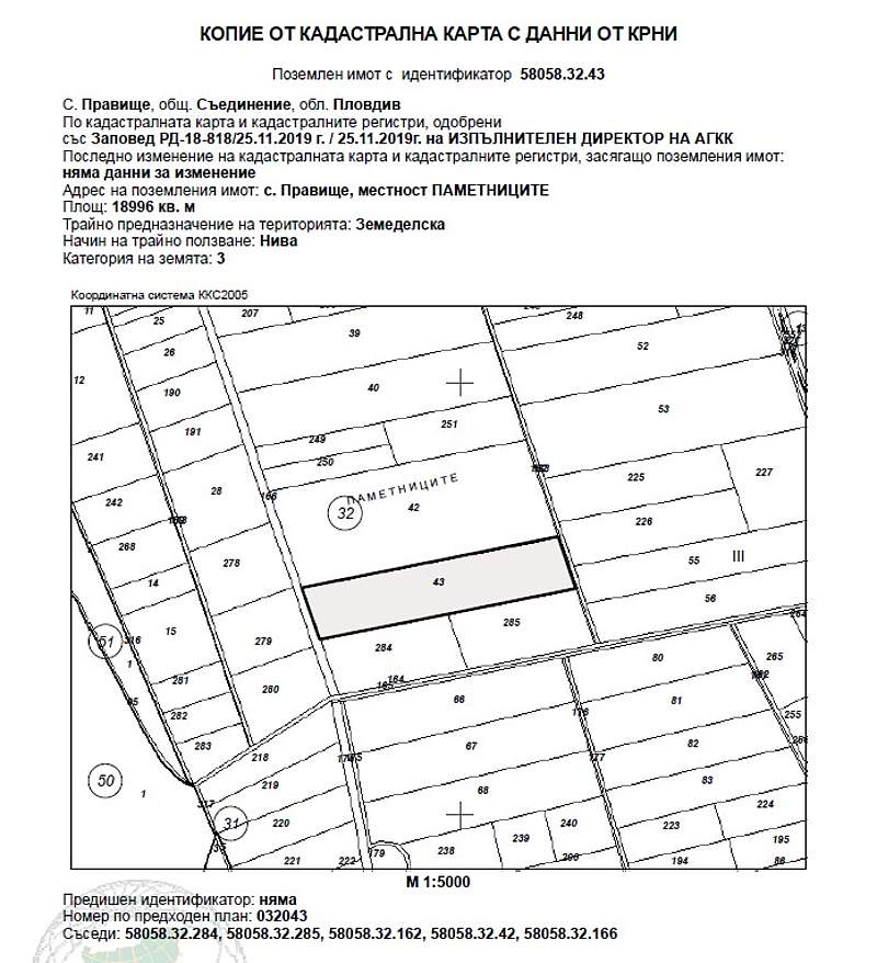 ИД 20228250400873Поземлен имот с идентификатор 58058.32.43 (пет, осем, нула, пет, осем, точка, три, две, точка, четири, три) по кадастралната карта и кадастралните регистри на с. Правище, община Съединение, област Пловдив, одобрени със Заповед за одобрение на КККР № РД-18-818/25.11.2019 г. на ИЗПЪЛНИТЕЛЕН ДИРЕКТОР НА АГКК, с адрес: с. Правище, община Съединение, м. ПАМЕТНИЦИТЕ, вид територия Земеделска, категория 3 (трета), начин на трайно ползване: Нива, площ 18996 кв.м(осемнадесет хиляди деветстотин деветдесет и шест квадратни метра), стар номер 032043, съседи: 58058.32.284, 58058.32.285, 58058.32.162, 58058.32.42, 58058.32.166, с описание съгласно акт за собственост: ПОЗЕМЛЕН ИМОТ №032043 (нула, три, две, нула, четири, три), в землището на село Правище, община Съединение, област Пловдив, ЕКАТТЕ 58058 /петдесет и осем хиляди и петдесет и осем/, с площ на имота от 18. 998 дка (осемнадесет декара и деветстотин деветдесет и осем квадратни метра), начин на трайно ползване - нива, категория на земята при неполивни условия - трета, който имот се намира в местността "Паметниците", при граници и съседи: имот № 032042 -нива на насл. на Лазар Ненов Ковачев, имот номер 032162- напоителен капал на Община Съединение - Канали, имот номер 032285 - нива на Иван Георгиев Попов, имот номер 032284- нива на Стоица Симеонова Доброджалийска, имот номер 032166 - напоителен канап на МЗГ – ХМС; Началната цена, от която ще започне публичната продан е в размер на 23 474,43 € (двадесет и три хиляди четиристотин седемдесет и четири евро и четиридесет и три евроцента), съставляваща 80 % от стойността на имота, съгласно чл. 485 от ГПК.