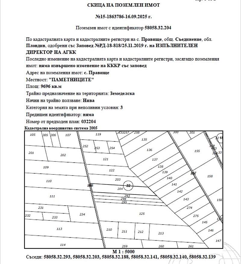 ИД 20228250400873Поземлен имот с идентификатор 58058.32.204 (пет, осем, нула, пет, осем, точка, три, две, точка, две, нула, четири) по кадастралната карта и кадастралните регистри на с. Правище, община Съединение, област Пловдив, одобрени със Заповед за одобрение на КККР № РД-18-818/25.11.2019 г. на ИЗПЪЛНИТЕЛЕН ДИРЕКТОР НА АГКК, с адрес: с. Правище, община Съединение, м. ПАМЕТНИЦИТЕ, вид територия Земеделска, категория 3 (трета), начин на трайно ползване: Нива, площ 9696 кв.м (девет хиляди шестстотин деветдесет и шест квадратни метра), стар номер 032204, съседи: 58058.32.293, 58058.32.141, 58058.32.140, 58058.32.139, 58058.32.203, 58058.32.188, с описание съгласно акт за собственост: ПОЗЕМЛЕН ИМОТ № 032204 /нула, три, две, две, нула, четири/, образуван от имот № 032123 /нула, три, две, едно, две, три/, находящ се в местността "Паметниците" в землището на село Правище, община Съединение, област Пловдив, ЕКАТТЕ 58058 /петдесет и осем хиляди и петдесет и осем/, с площ па имота от 9,697 дка. /девет декара, шестстотин деветдесет и седем квадратни метра/, начин на трайно ползване - нива, категория на земята при неполивни условия - трета (6,961). шора (2,736), при граници и съседи: имот № 032203 нива на Стоил Георгиев Попов; имот № 032188 - полски пьт на Община Съединение; имот № 032293 - нива на Видол Василев Джонгов; имот № 032141 - нива на Илина Енева Кренчева; имот № 032140 - нива на Емил Атанасов Пелтеков и имот № 032139 - нива на Никола Танов Мекиков; Началната цена, от която ще започне публичната продан е в размер на 10 720,77 € (десет хиляди седемстотин и двадесет евро и седемдесет и седем евроцента), съставляваща 80 % от стойността на имота, съгласно чл. 485 от ГПК.