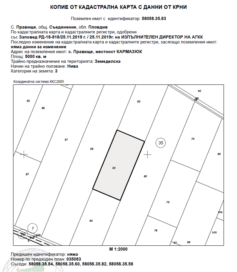 ИД 202282507400873Поземлен имот с идентификатор58058.35.83(пет, осем, нула, пет, осем, точка, три, пет, точка, осем, три) по кадастралната карта и кадастралните регистри на с. Правище, община Съединение, област Пловдив, одобрени със Заповед за одобрение на КККР № РД-18-818/25.11.2019 г. на ИЗПЪЛНИТЕЛЕН ДИРЕКТОР НА АГКК, с адрес: с. Правище, община Съединение, м.КАРМАЗЮК,вид територия Земеделска, категория 3 (трета), Начин на трайно ползване: Нива,с площ:5000 кв.м (пет хиляди квадратни метра), стар номер 035083, съседи: 58058.35.84; 58058.35.60; 58058.35.82; 58058.35.58, с описание по акт за собственост: НИВА с площ от 5.000 дка - пет декара, трета категория на земята, находящаа се в местността "КАРМАЗЮК", в землището на с. Правище с ЕКАТТЕ 58058 (пет осем нула пет осем), общ. Съединение, обл. Пловдив, съставляваща имот № 035083 (нула, три, пет, нула, осем, три), при граници и съседи по скица: имот № 035084 – Нива на Христо Иванов Ненчев, имот № 035060 - Нива на Дафина Георгиева Щерева, имот № 035082 - Нива на Атанас Ангелов Пелтеков и имот № 035058 - Нива на насл. на Стоичко Маринов Шилев, ведно с всички настоящи и бъдещи подобрения и приращения в имота. Началната цена, от която ще започне публичната продан е в размер на 5 530,13 € (пет хиляди петстотин и тридесет евро и тринадесет евроцента), съставляваща 80 % от стойността на имота, съгласно чл. 485 от ГПК.