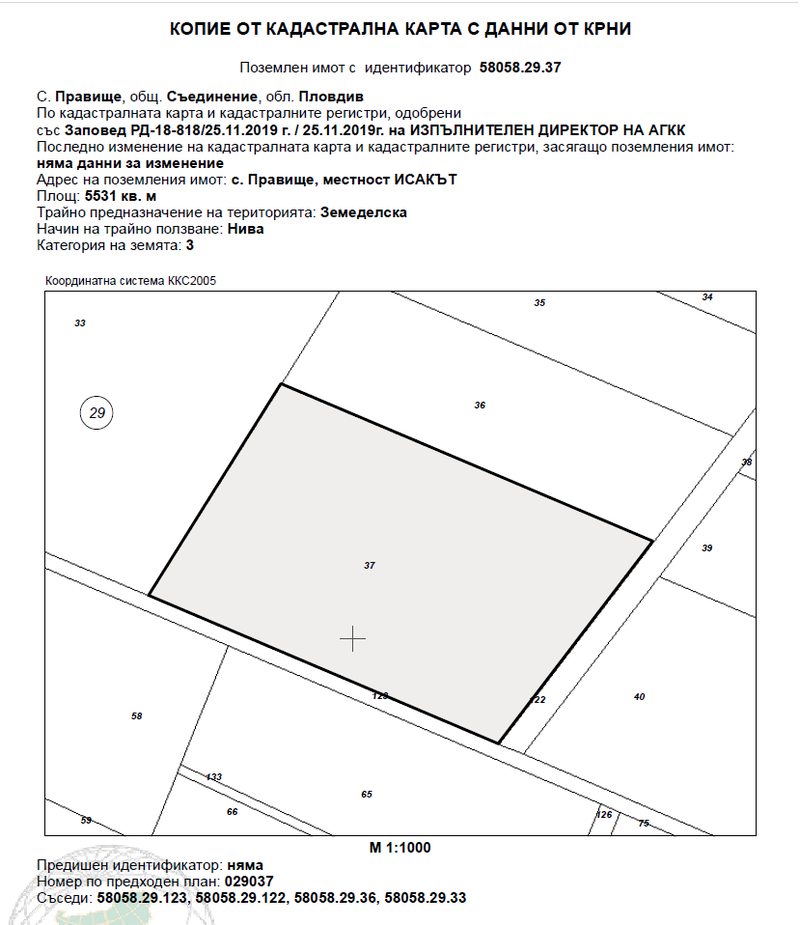 ИД 20228250400873Поземлен имотс идентификатор 58058.29.37 (пет, осем, нула, пет, осем, точка, две, девет, точка, три, седем) по кадастралната карта и кадастралните регистри на с. Правище, община Съединение, област Пловдив, одобрени със Заповед за одобрение на КККР № РД-18-818/25.11.2019 г. на ИЗПЪЛНИТЕЛЕН ДИРЕКТОР НА АГКК, с адрес: с. Правище, община Съединение, м. ИСАКЪТ, вид територия Земеделска, категория 3 (трета), Начин на трайно ползване: Нива,с площ:5531 кв.м (пет хиляди петстотин тридесет и един квадратни метра), стар номер 029037, съседи: 58058.29.123, 58058.29.122, 58058.29.36, 58058.29.33, с описание по акт за собственост: ПОЗЕМЛЕН ИМОТ № 029037 /нула, две, девет, нула, три, седем/, находящ се в землището на село Правище, община Съединение, област Пловдив, ЕКАТТЕ 58058 /петдесет и осем хиляди и петдесет и осем/, с площ на имота от 5,531 дка /пет декара и петстотин и тридесет и един квадратни метра/, начин на трайно ползване - Нива, категория на земята при неполивни условия – трета, който имот се намира в местността ,ИСАКЪТ", при граници и съседи: имот № 029122 - Полски път на Община Съединение, имот № 029036 - нива на Видол Василев Джонгов, имот № 029033 - Нива на Николай Димитров Бухалски, имот № 029123 - напоителен канал на Община Съединение - канали, ведно с всички настоящи и бъдещи подобрения и приращения в имота. Началната цена, от която ще започне публичната продан е в размер на 7 194,90 € (седем хиляди сто деветдесет и четири евро и деветдесет евроцента), съставляваща 80 % от стойността на имота, съгласно чл. 485 от ГПК.