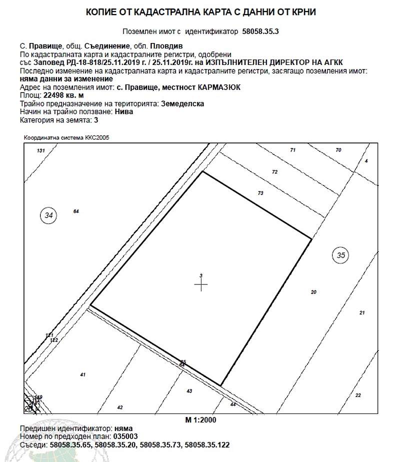 ИД № 20238250400573 -1/3 ид. ч.(една трета идеална част) отПоземлен имот с идентификатор 58058.35.3 (пет, осем, нула, пет, осем, точка, три, пет, точка, три) по кадастралната карта и кадастралните регистри на с. Правище, община Съединение, област Пловдив, одобрени със Заповед за одобрение на КККР № РД-18-818/25.11.2019 г. на ИЗПЪЛНИТЕЛЕН ДИРЕКТОР НА АГКК, с адрес: с. Правище, община Съединение, м. КАРМАЗЮК, вид територия Земеделска, категория 3 (трета), Начин на трайно ползване: Нива, с площ 22498 кв.м (двадесет и две хиляди четиристотин деветдесет и осем квадратни метра), стар номер 035003, при граници 58058.35.65; 58058.35.20; 58058.35.73; 58058.35.122, с описание по нотариален акт НИВА с площ от 22.500 дка /двадесет и два декара и петстотин квадратни метра/, трета категория на земята, находяща се в местността КАРМАЗЮК, в землището на с. Правище, ЕКАТТЕ 58058, община Съединение, обл. Пловдив, съставляваща имот № 035003 /нула три пет нула нула три/ при граници и съседи по скица: имот № 035065 - Полски път на Община Съединение, имот № 000122 - Напоителен канал на Община Съединение- Канали, имот № 035073 - Нива на Ангел Георгиев Команов и имот № 035020 - Нива на Стоян Кралинов Мирев Началната цена, от която ще започне публичната продан е в размер на 6 536,36 € (шест хиляди петстотин тридесет и шест евро и тридесет и шест евроцента), съставляваща 80 % от стойността на имота, съгласно чл. 485 от ГПК.