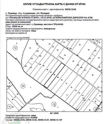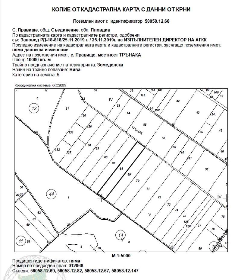 ИД № 20238250400573 -½ (една втора) идеална част от19/30 ид.ч./деветнадесет тридесети идеални части/ отПоземлен имот с идентификатор 58058.12.68 (пет, осем, нула, пет, осем, точка, едно, две, точка, шест, осем) по кадастралната карта и кадастралните регистри на с. Правище, община Съединение, област Пловдив, одобрени със Заповед за одобрение на КККР № РД-18-818/25.11.2019 г. на ИЗПЪЛНИТЕЛЕН ДИРЕКТОР НА АГКК, с адрес: с. Правище, община Съединение, м. ТРЪНАКА, вид територия Земеделска, категория 5 (пета), Начин на трайно ползване: Нива, с площ 10000 кв.м (десет хиляди квадратни метра), стар номер 012068, при граници 58058.12.69; 58058.12.82; 58058.12.67; 58058.12.147, с описание по нотариален акт НИВА с площ от 10.001 дка /десет декара и един квадратен метър/, от които 0.830 дка /осемстотин и тридесет квадратни метра/ седма категория, 6.740 дка /шест декара и седемстотин и четиридесет квадратни метра/ пета категория и 2.431 дка /два декара четиристотин тридесет и един квадратни метра/ четвърта категория на земята при неполивни условия, съставляваща имот № 012068 /нула, едно, две, нула. шест, осем/, находящ се в местността "ТРЪНАКА", в землището на с. Правище с ЕКАТТЕ 58058 /пет, осем, нула, пет, осем/, общ. Съединение, обл. Пловдив, при граници и съседи: имот № 012067 - Нива на насл. на Петър Георгиев Чобанов, имот № 012082 – Напоител. Канал на Обшина "Съединение" - Канали, имот № 012069 - Нива на Слава Петрова Шилева и имот № 000010 - Полски път на Община "Съединение". Началната цена, от която ще започне публичната продан е в размер на 2 760,98 € (две хиляди седемстотин шестдесет евро и деветдесет и осем евроцента), съставляваща 80 % от стойността на имота, съгласно чл. 485 от ГПК.