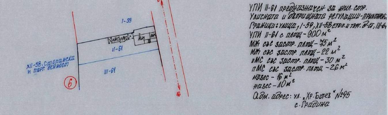 ИД 20258200400964Урегулиран поземлен имотII— 61 (втори — шестдесет и първи) от кв. № 6 (шест) по застроителния и регулационен план на с. Градина, утвърден със Заповед № 772 / 1974 г., с предназначение за жилищно строителство, целият, застроен и незастроен с площ от 900 (деветстотин) квадратни метра, с приложени регулации, с административен адрес: село Градина, община Първомай, област Пловдив, ул. ,,Христо Ботев" № 95,ведно с построените върху него жилищна сграда със застроена площ от 75 (седемдесет и пет) квадратни метра, лятна кухня със застроена площ от 22 (двадесет и два) квадратни метра, стопанска постройка със застроена площ от 56 (петдесет и шест) квадратни метра и навеси с обща покрита площ от 26 (двадесет и шест) квадратни метра, при граници на УПИ: улица, УПИ-I-59, УПИ-XII-58 стопанска и търговска дейност и УПИ-III-61.Началната цена, от която ще започне наддаването при публичната продан, е в размер на 16 812 € (шестнадесет хиляди осемстотин и дванадесет евро) / 32 881,42 лв. (тридесет и две хиляди осемстотин осемдесет и един лева и четиридесет и две стотинки), съставляваща 80 % от стойността на имота, съгласно чл. 485, ал. 4 от ГПК.Цената се заплаща в ЕВРО по банков път!