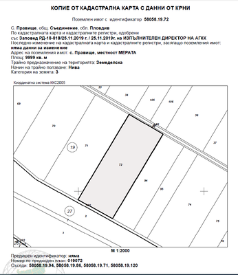 ИД 20228250400873Поземлен имотс идентификатор58058.19.72(пет, осем, нула, пет, осем, точка, едно, девет, точка, седем, две)по кадастралната карта и кадастралните регистри на с. Правище, община Съединение, област Пловдив, одобрени със Заповед за одобрение на КККР № РД-18-818/25.11.2019 г. на ИЗПЪЛНИТЕЛЕН ДИРЕКТОР НА АГКК, с адрес: с. Правище, община Съединение, м. МЕРАТА, вид територия Земеделска, категория 3 (трета), Начин на трайно ползване: Нива, с площ: 9999 кв.м (девет хиляди деветстотин деветдесет и девет квадратни метра), стар номер 019072, съседи: 58058.19.94, 58058.19.86, 58058.19.71, 58058.19.120, с описание по акт за собственост: ПОЗЕМЛЕН ИМОТ № 019072 (нула, едно, девет, нула, седем, две), находящ се в местността "МЕРАТА" в землището на село Правище, ЕКАТТЕ 58058 (петдесет и осем хиляди и петдесет и осем), общ. Съединение, обл. Пловдив, с площ от 10,000 дка (десет декара), начин на трайно ползване - НИВА, категория на земята при неполивни условия -трета, при граници и съседи: имот № 019094 – нива, имот № 019086 - нива напоителен канал, имот № 019071 – нива и имот № 000074 – полски път, ведно е всички настоящи и бъдещи подобрения и приращения в имота. Началната цена, от която ще започне публичната продан е в размер на 22896,00 лв. (двадесет и двехиляди осемстотин деветдесет и шестлева), съответно 11 706,54 € (единадесет хилядиседемстотин и шест евро ипетдесет и четириевроцента), съставляваща 80 % от стойността на имота, съгласно чл. 485 от ГПК.