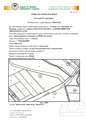 УРЕГУЛИРАН ПОЗЕМЛЕН ИМОТ № 092062 (нула, девет, две, нула, шест, две)- производствени и обслужващи дейности/производство и търговия на растителна и селскостопанска продукция/, с площ от 8,002 дка(осем декара и два квадратни метра), начин на трайно ползване: производствен терен, категория на земята при неполивни условия- 5 (пета), находящ се в землището на с. Стряма, община Раковски, област Пловдив, местността " ТОП КОРИЯ", при граници на имота: имот № 000043- напоителен канал на община Раковски, имот № 092063— нива на Чавдар Христов Георгиев и др., имот № 000042— път II клас на Министерството на транспорта, ведно с всички подобрения и приращения в имота, който недвижим имот е с променено предназначение с Решение № 3/08.03.2007г. на Комисията по чл. 17, ал. 1, т. 1 от 3033 към Областна дирещия "Земеделие гр. Пловдив, влязло в сила на 05.04.2007г., и за който недвижим имот, съгласно Уведомление от община Раковски с изх. №11- 63-12/07.06.2022г. не е издавано Разрешение за строеж и не са изготвяни протоколи за откриване на строителна площадка и определяне на линия и ниво на строежа, с описание по скица поземлен имот с идентификатор 70010.92.62 /седем нула нула едно нула точка девет две точка шест две/ по кадастралната карта и кадастралните регистри на с. Стряма, общ. Раковски, обл. Пловдив, одобрени със Заповед №РД-18-95/10.05.2023 г. на ИЗПЪЛНИТЕЛЕН ДИРЕКТОР НА АГКК, с адрес на поземления имот: с. Стряма, местност: "ТОП КОРИЯ", с площ: 8002 /осем хиляди и два/ кв.м, трайно предназначение на територията: земеделска, начин на трайно ползване: за друг вид производствен, складов обект, категория на земята при неполивни условия: 5, предишен идентификатор: няма, номер от предходен план: 092062, при съседи: 70010.34.394, 70010.92.63, 70010.92.77;