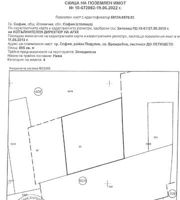 ПОЗЕМЛЕН ИМОТ с идентификатор 68134.8578.83 /шестдесет и осем хиляди сто тридесет и четири точка осем хиляди петстотин седемдесет и осем точка осемдесет и три/, находящ се в гр. София, СО – район "Кремиковци", кв. "Враждебна", местност "До летището", с площ от 886.00/осемстотин осемдесет и шест/ квадратни метра, трайно предназначение на територията: земеделска, начин на трайно ползване: нива, стар идентификатор: няма, номер по предходен план: 157083 /едно, пет, седем, нула, осем, три/ при съседи: № 68134.8578.80, № 68134.8578.109, № 68134.85578.1395, а по решение на ПК, представляващо нива с площ 886,00 /осемстотин осемдесет и шест/ квадратни метра, 4 /четвърта/ категория, местност "До летището", съставляващ имот № 157083 /масив сто петдесет и седем, имот осемдесет и три/, при съседи по решение: имот № 157083 – пасище, мера на Недялко Георгиев Костов, имот № 157080, нива на насл. на Никола Панчев Лазаров, имот № 000135 – населено място на кв. "Враждебна", имот № 157103 – нива на "Ай Ее Ди – България" ООДлице за контакт Кристиан Кръстанов, тел. 089 33 54 287, e-mail: [. protected]