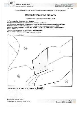 ПОЗЕМЛЕН ИМОТ с идентификатор 58517.35.28 по кадастралната карта и кадастралните регистри на с. Проглед, общ. Чепеларе, обл. Смолян, одобрени със Заповед № РД-18-1/20.01.2006 г. на Изпълнителния директор на АГКК, с площ от 1870 кв. м. (хиляда осемстотин и седемдесет квадратни метра), с трайно предназначение на територията: Урбанизирана, с начин на трайно ползване: За друг вид застрояване, находящ се в землището на с. Проглед, ЕКАТТЕ 58517, общ. Чепеларе, обл. Смолян, местност Томов чучур, при граници и съседи на поземления имот по кадастралната карта и кадастралните регистри: поземлени имоти с идентификатори 58517.35.29, 58517.35.30, 58517.35.27, 58517.209.1, който имот представлява УПИ III – База за отдих и който е образуван от поземлен имот с идентификатор 58517.35.12, с площ на целия имот от 10423 кв.м. (десет хиляди четиристотин двадесет и три квадратни метра), съгласно Заповед № 94-В-90/18.04.2006 г. на Кмета на Община Чепеларе.https://zapori.mjs.bg/#/announcements/display/3371