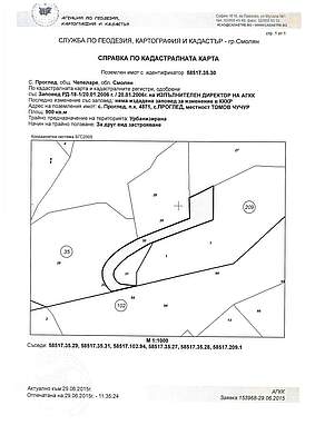 ПОЗЕМЛЕН ИМОТ с идентификатор 58517.35.30 по кадастралната карта и кадастралните регистри на с. Проглед, общ. Чепеларе, обл. Смолян, одобрени със Заповед № РД-18-1/20.01.2006 г. на Изпълнителния директор на АГКК, с площ от 900 кв. м. (деветстотин квадратни метра), с трайно предназначение на територията: Урбанизирана, с начин на трайно ползване: За друг вид застрояване, находящ се в землището на с. Проглед, ЕКАТТЕ 58517, общ. Чепеларе, обл. Смолян, местност Томов чучур, при граници и съседи на поземления имот по кадастралната карта и кадастралните регистри: поземлени имоти с идентификатори 58517.35.29, 58517.35.31, 58517.102.94, 58517.35.27, 58517.35.28, 58517.209.1, който имот попада в улична регулация и който е образуван от поземлен имот с идентификатор 58517.35.12, с площ на целия имот от 10423 кв.м. (десет хиляди четиристотин двадесет и три квадратни метра), съгласно Заповед № 94-В-90/18.04.2006 г. на Кмета на Община Чепеларе.
