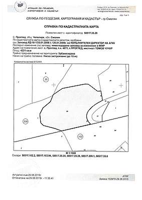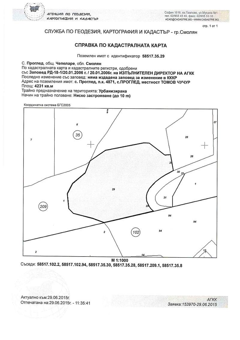 ПОЗЕМЛЕН ИМОТ с идентификатор 58517.35.29 по кадастралната карта и кадастралните регистри на с. Проглед, общ. Чепеларе, обл. Смолян, одобрени със Заповед № РД-18-1/20.01.2006 г. на Изпълнителния директор на АГКК, с площ от 4230 кв. м. (четири хиляди двеста и тридесет квадратни метра), с трайно предназначение на територията: Урбанизирана, с начин на трайно ползване: Ниско застрояване (до 10 м), находящ се в землището на с. Проглед, ЕКАТТЕ 58517, общ. Чепеларе, обл. Смолян, местност Томов чучур, при граници и съседи на поземления имот по кадастралната карта и кадастралните регистри: поземлени имоти с идентификатори 58517.102.2, 58517.102.94, 58517.35.30, 58517.35.28, 58517.209.1, 58517.35.8, който имот представлява УПИ II – База за отдих и който е е образуван от поземлен имот с идентификатор 58517.35.12, с площ на целия имот от 10423 кв.м. (десет хиляди четиристотин двадесет и три квадратни метра), съгласно Заповед № 94-В-90/18.04.2006 г. на Кмета на Община Чепеларе.
